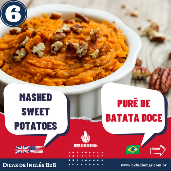 6: Mashed Sweet Potatoes = “Purê de Batata Doce”. Quando queremos nos referir a “purê” de batata, batata doce etc, usamos a palavra mashed. Já a palavra purée é mais usada para se referir a “purê” de frutas (apple purée, tomato purée etc).