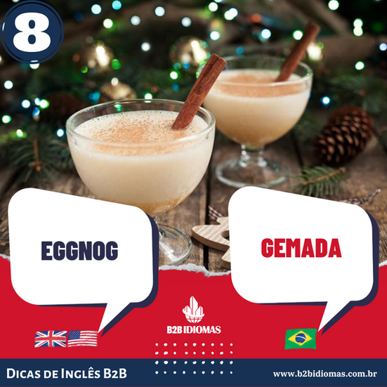 8: Eggnog = “Gemada”. Eggnog é um tipo diferente de gemada, mas podemos chamá-la assim. Ela consiste em uma mistura cremosa à base de ovos, leite, açúcar e especiarias, geralmente servida fria e polvilhada com noz-moscada ou canela.