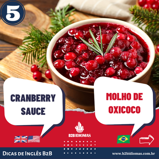 5: Cranberry Sauce = “Molho de Oxicoco”. Cranberry é uma fruta pequena e vermelha, nativa da América do Norte. O nome dela em português é “oxicoco”.